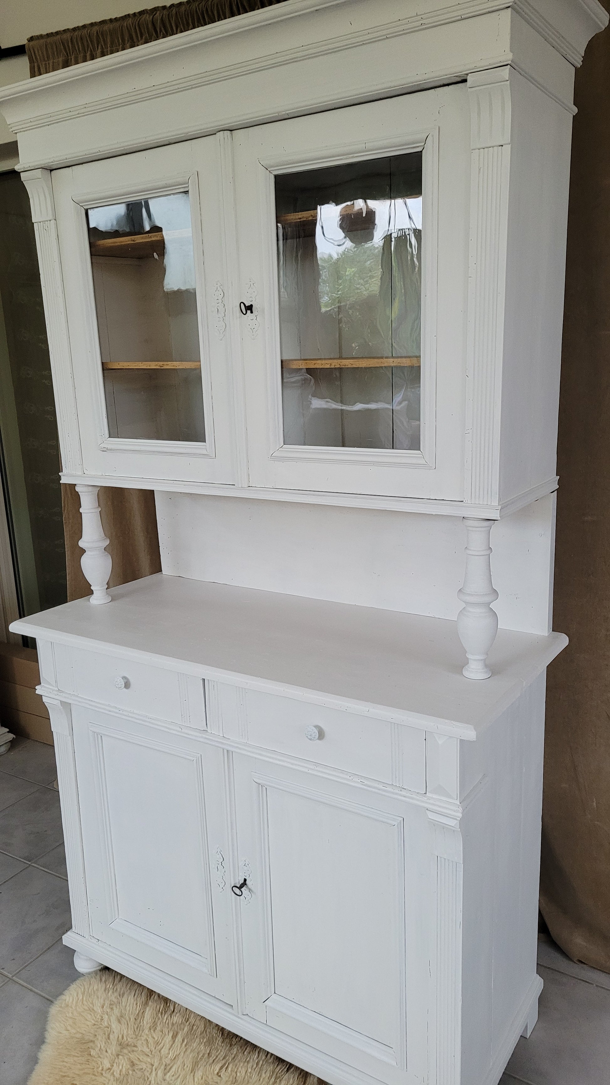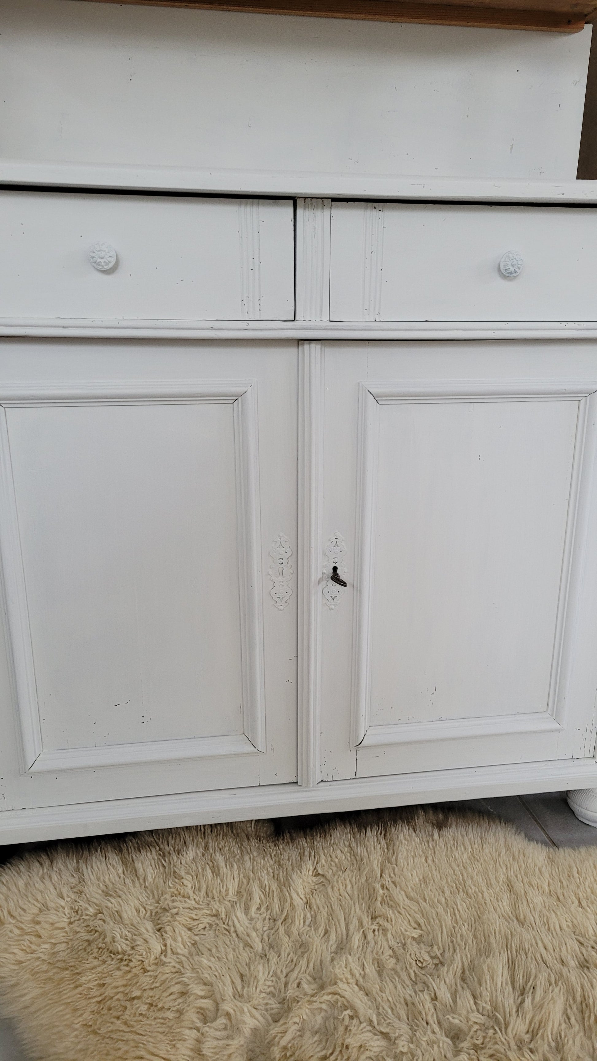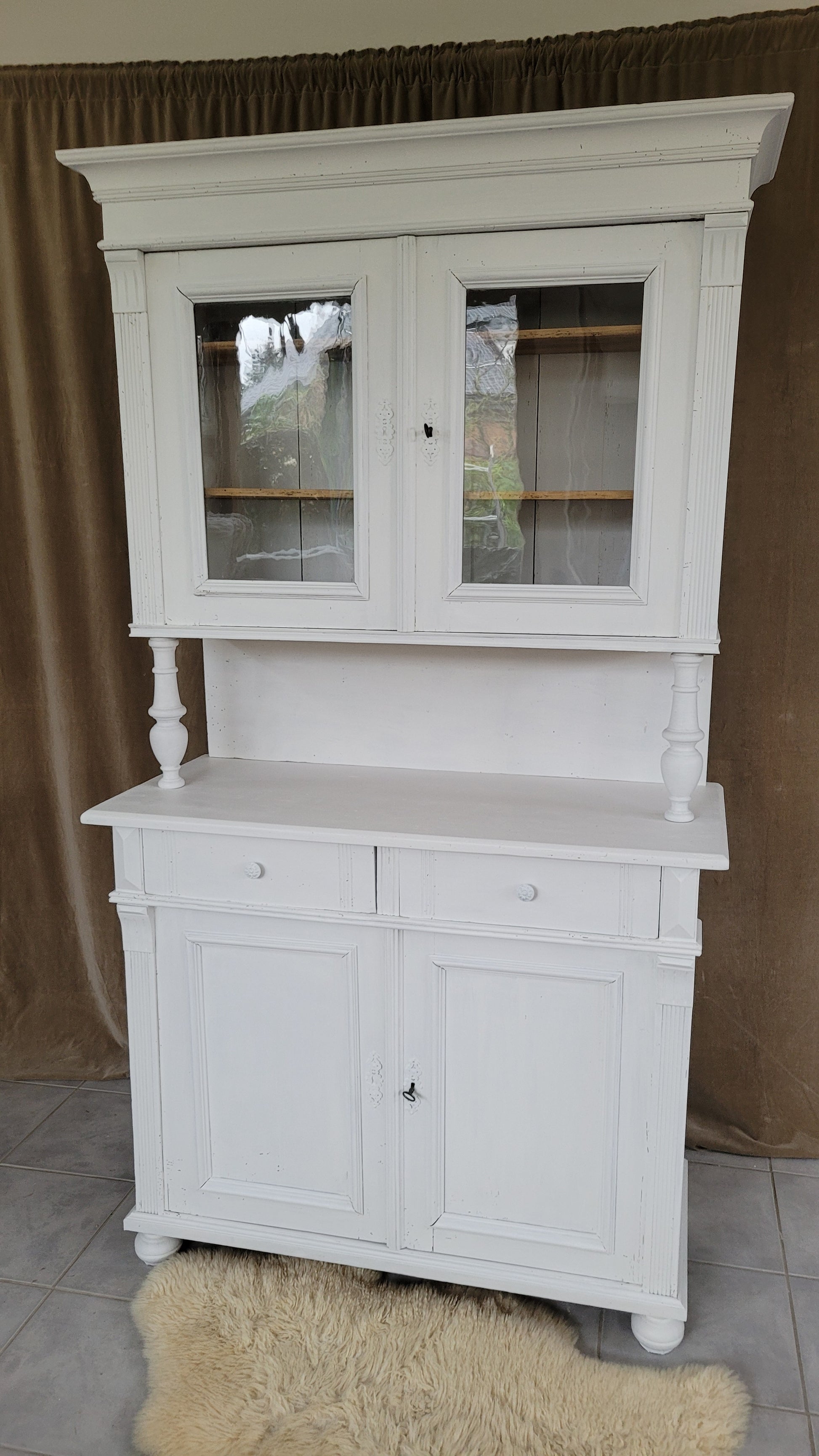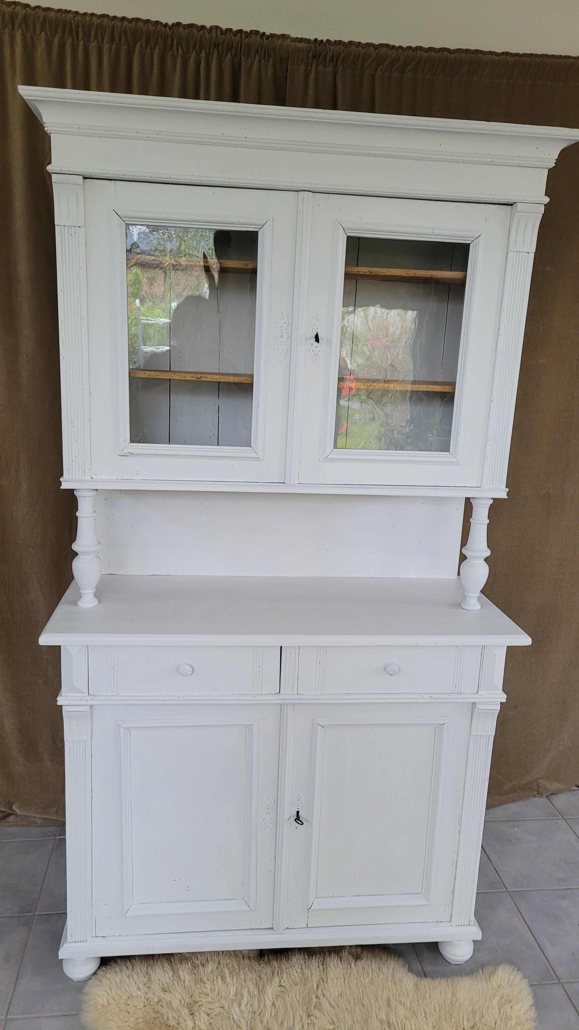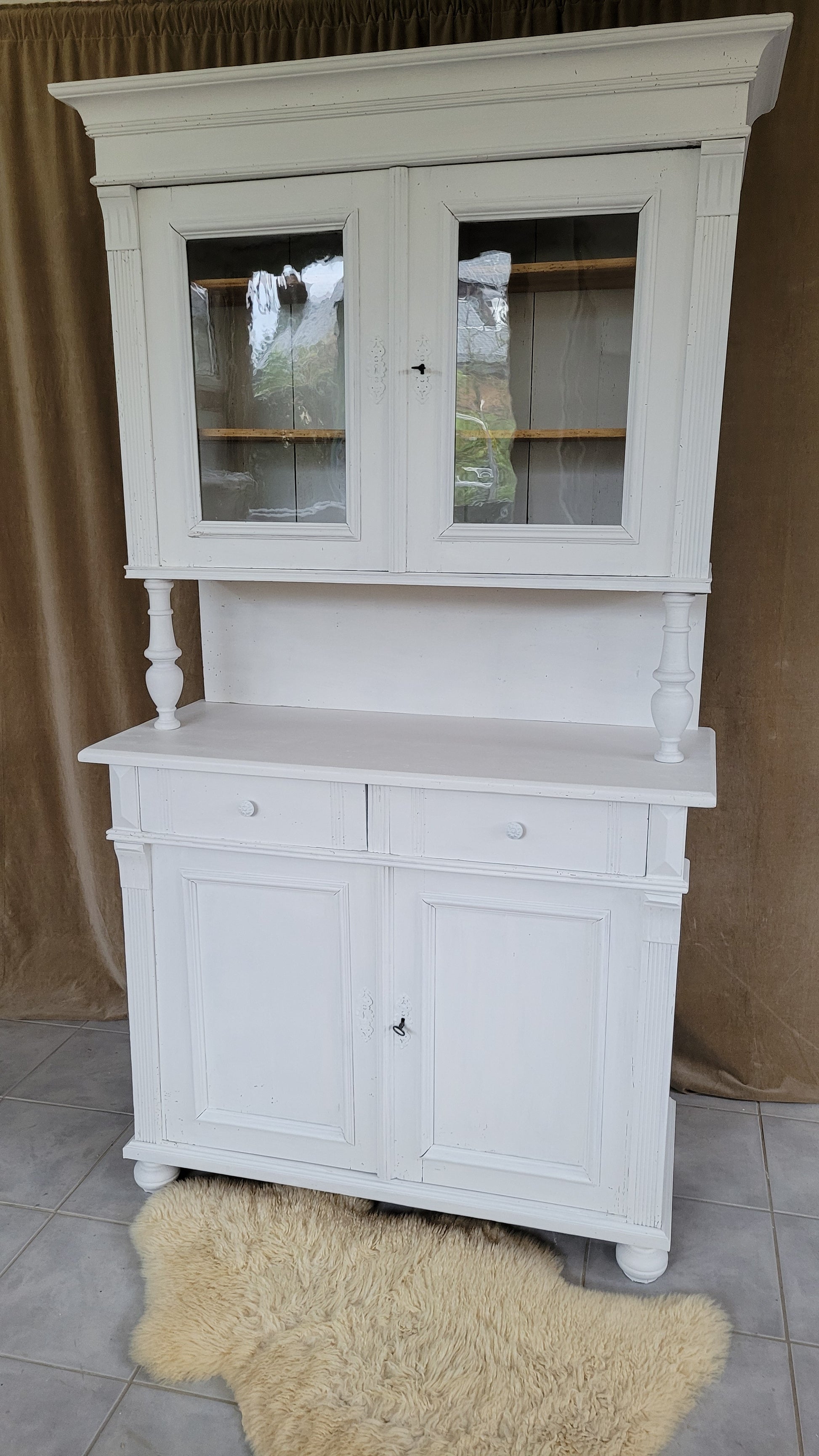 Massiv in Weichholz gebaut, vor Jahrzehnten schon wurde der Oberschrank auf Säulen gestellt, um eine leichtere und edlere Optik zu erhalten.