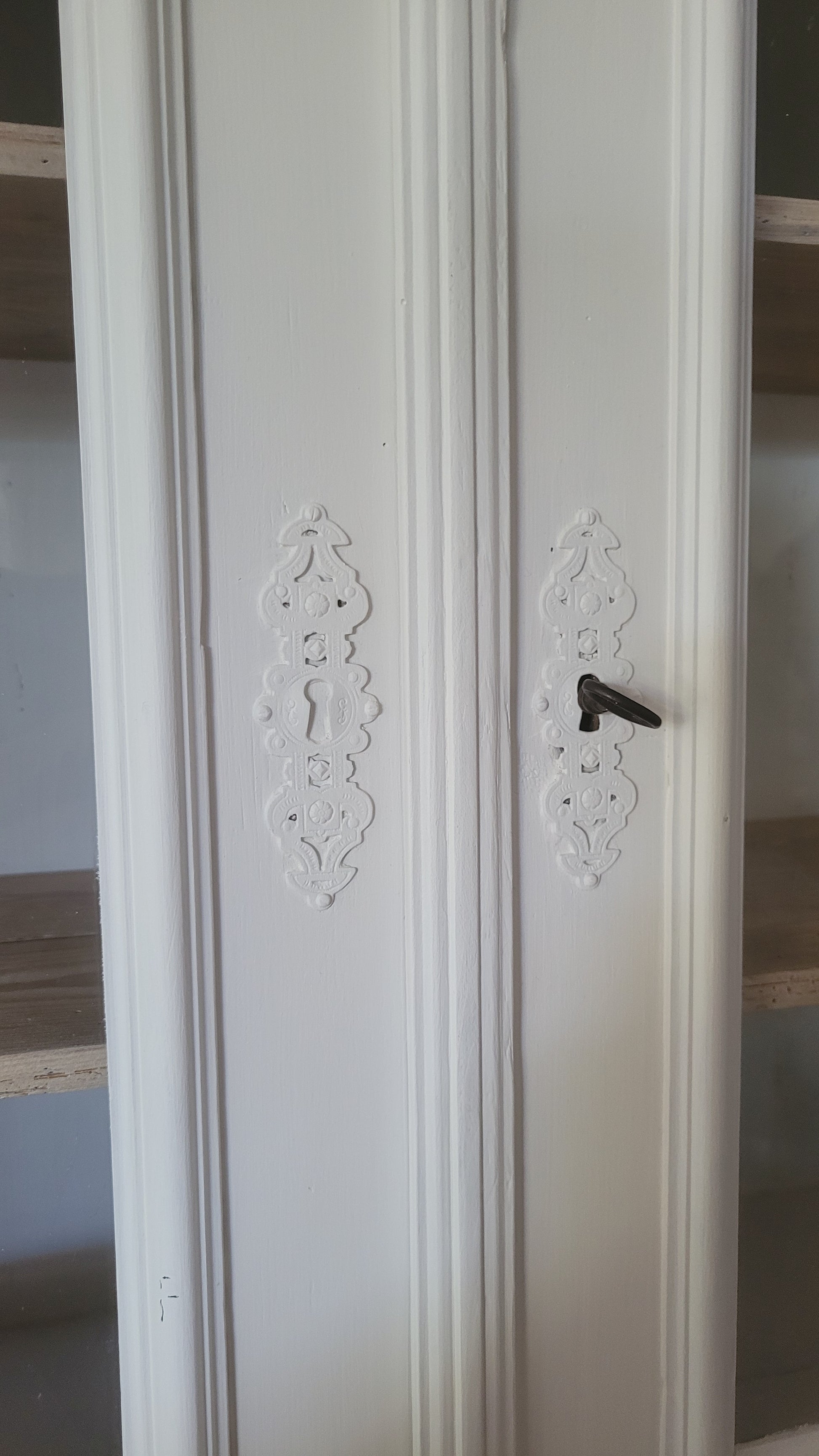 Zu den drei originalen Schlössern gibt es noch 2 (unterschiedliche) Schlüssel, die originalen Beschläge sind auch farblich gestaltet- wir konnten nicht widerstehen, einfach zu schön... Die Schubkastengriffe fehlten, da haben wir passende ergänzt.