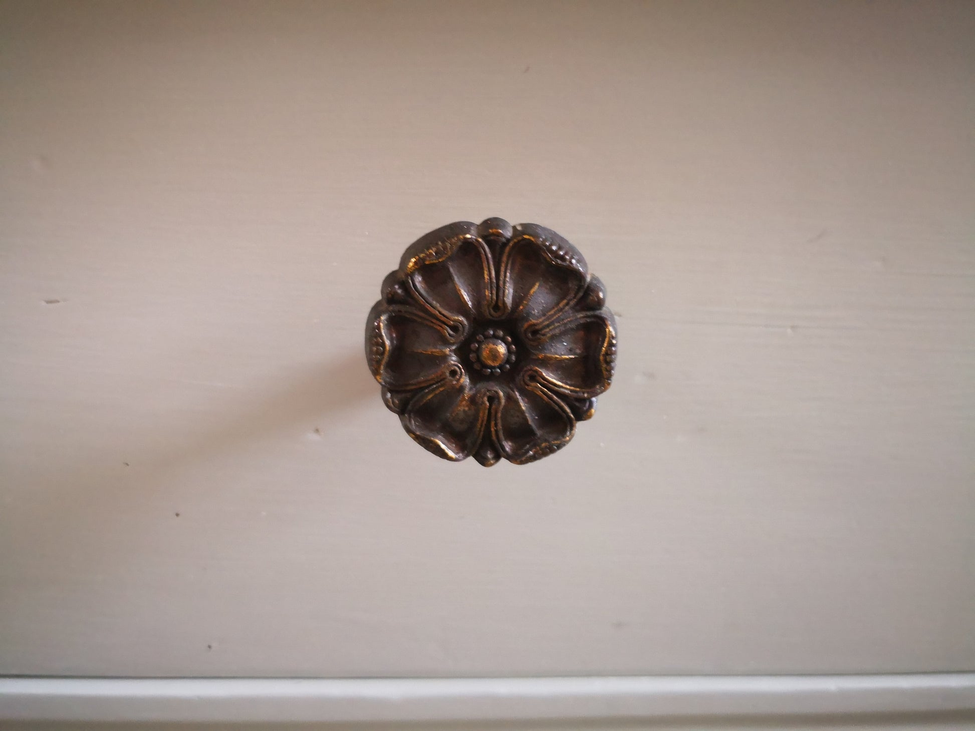 Ausgestattet oben mit zwei kleinen, darunter mit zwei großen Schubladen, Schubladenfronten komplett überarbeitet mit tollen alten gußeisernen Griffen im Blumendesign. Die Schubladen sind selbstverständlich auch von innen aufbereitet haben und bieten somit viel nutzbaren Stauraum.