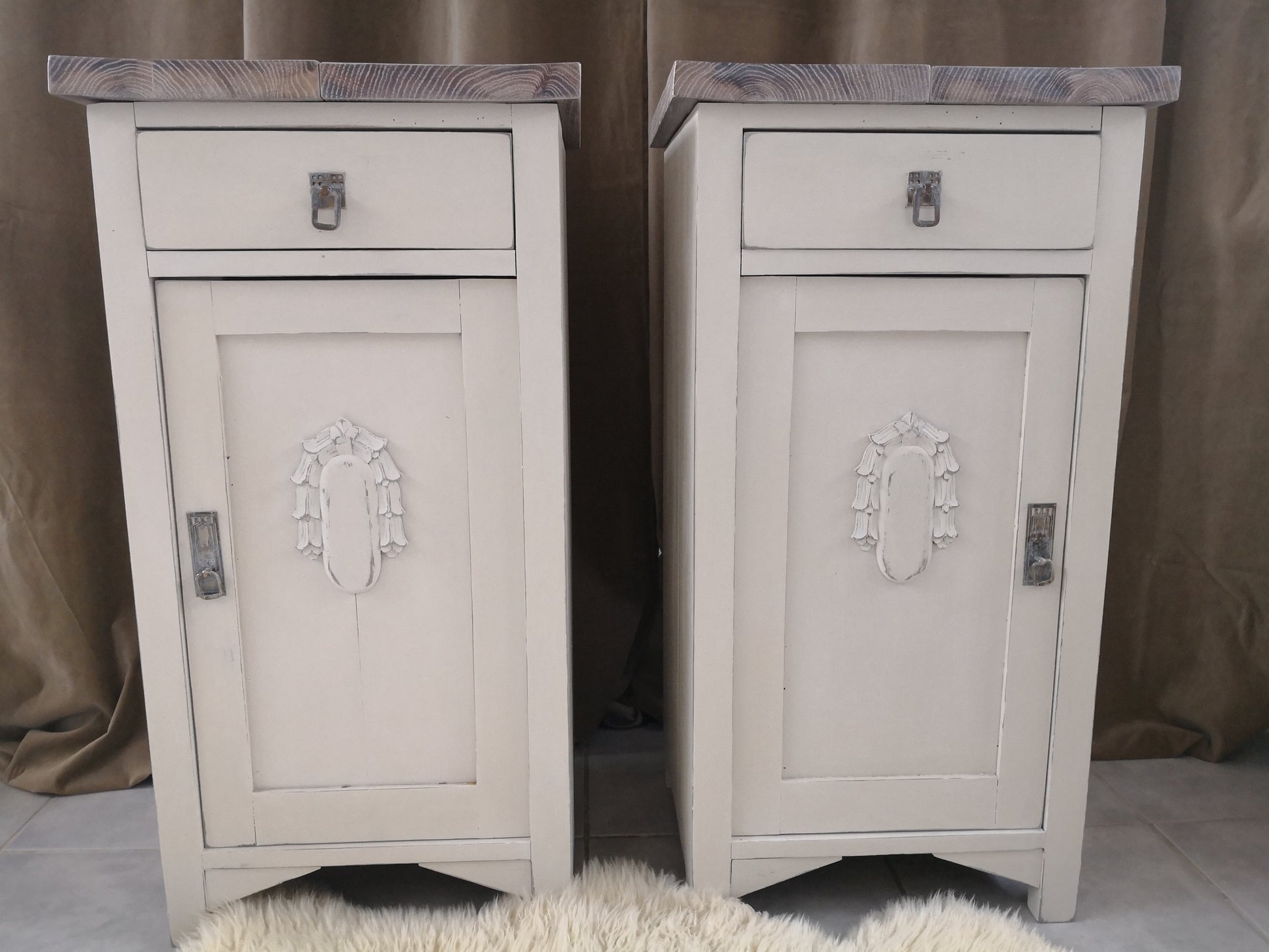 Wiir bieten Euch ein Paar antiker, neu gestylter Nachtschränkchen aus Massivholz Eiche in dezentem Landhauslook an, mindestens 80 Jahre alt.