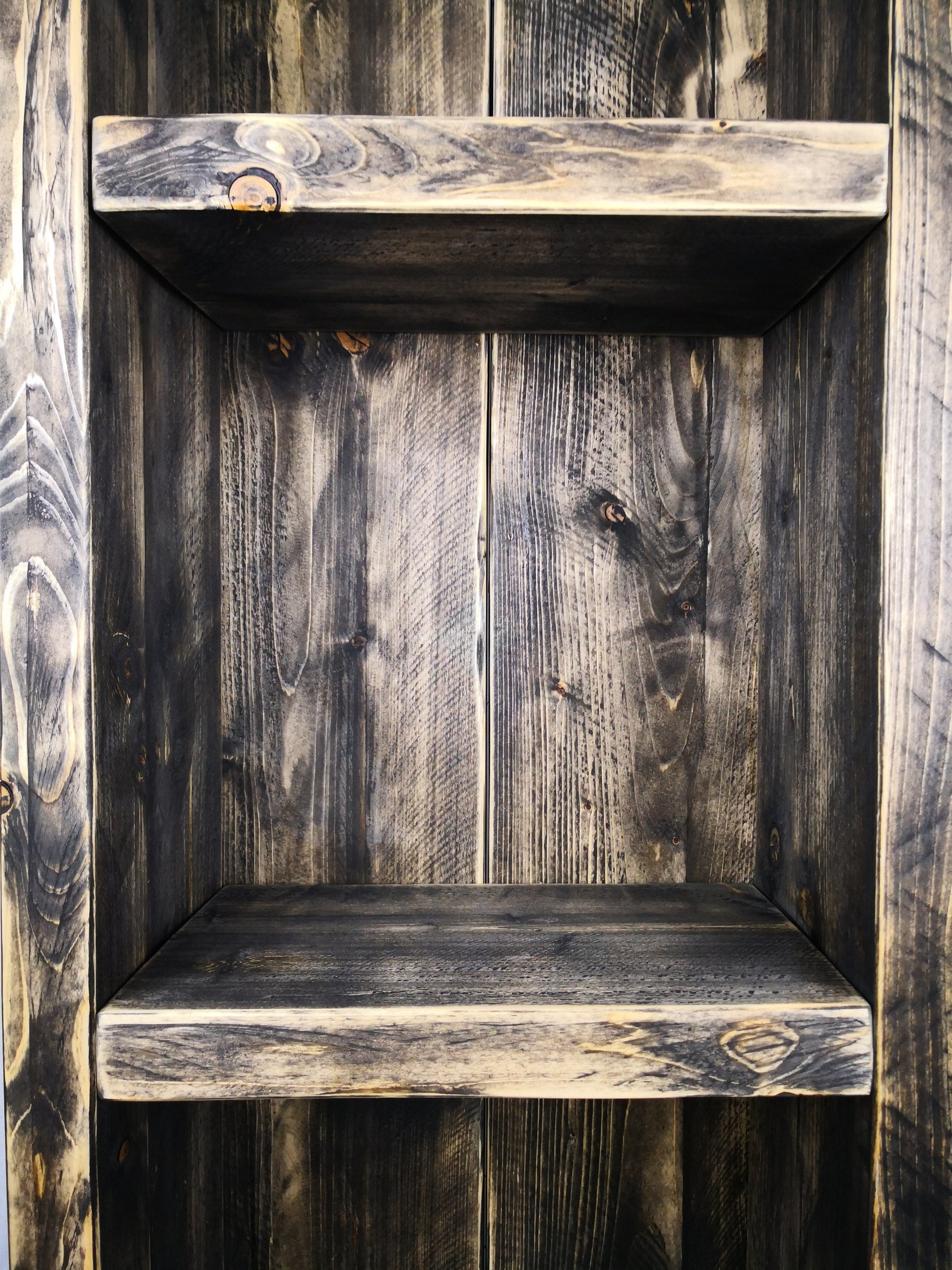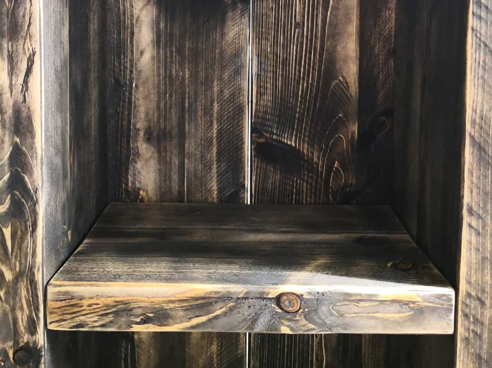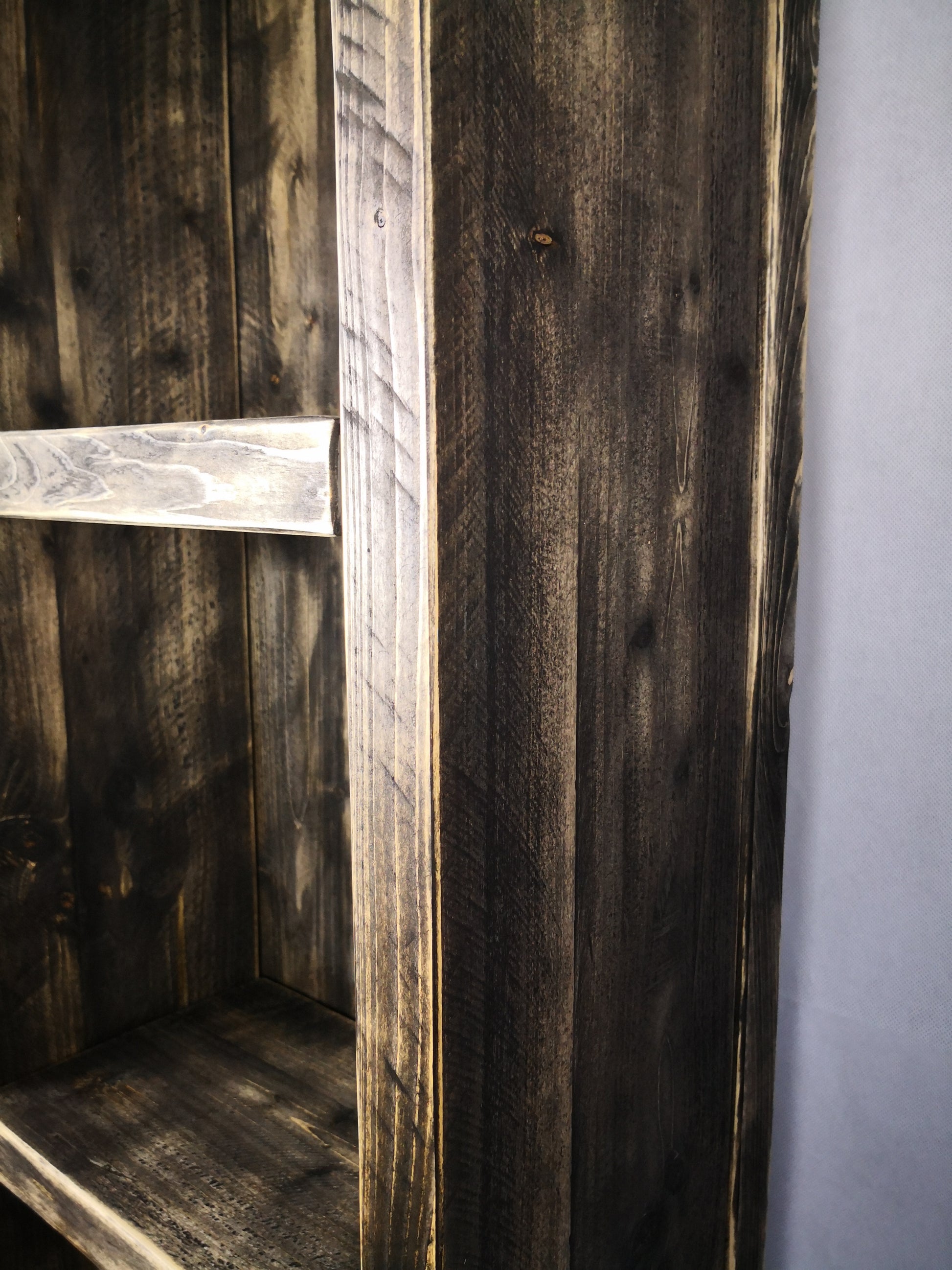 Das Regal ist gebeizt und geschliffen, dann mit Hartwachsöl behandelt.