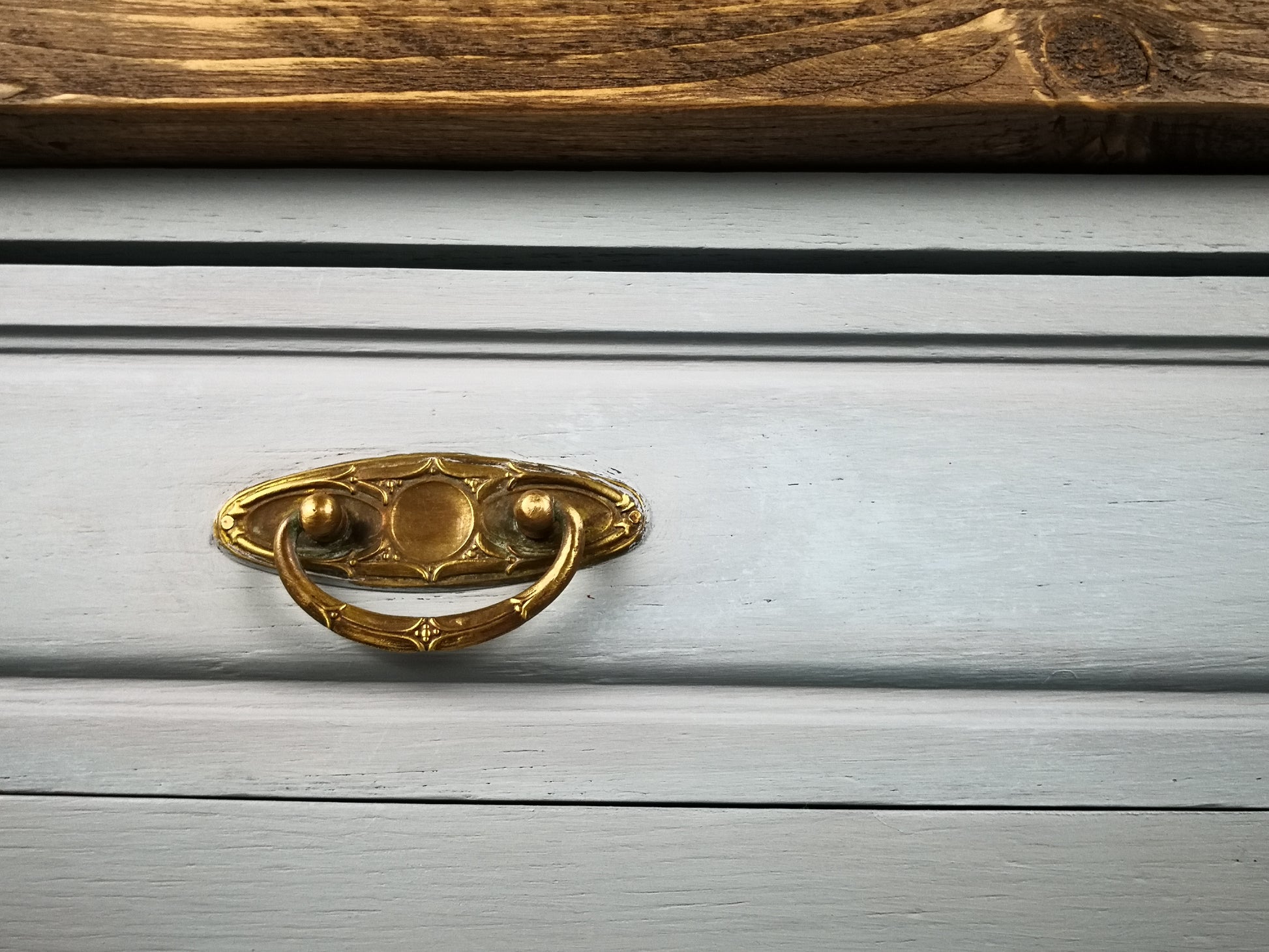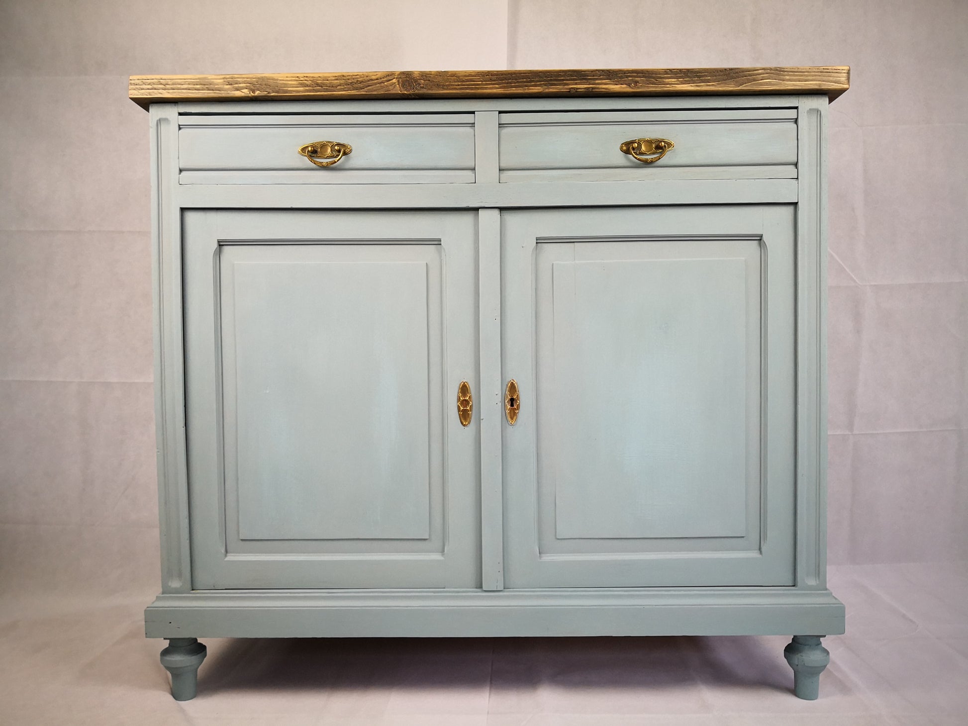 Wir haben für Euch diese große vintage Anrichte kplt. überarbeitet und mit Kreidefarbe in "french blue" einen neuen Look verpasst.
