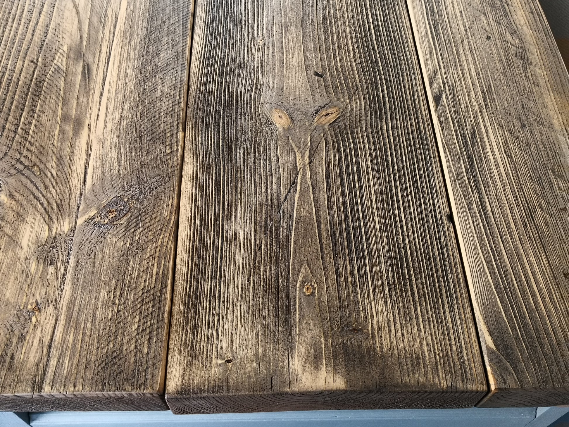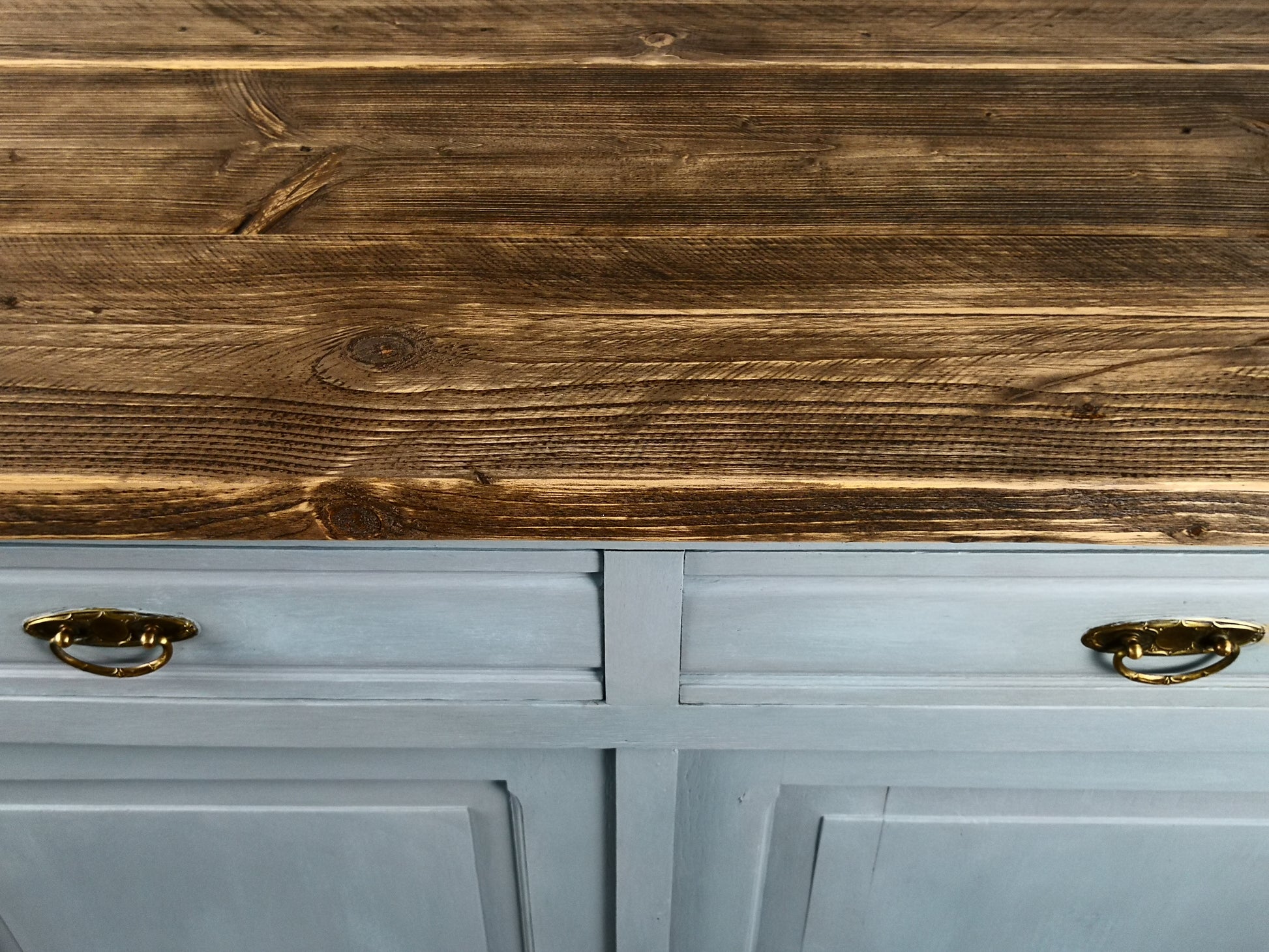 Die originale Platte war nicht mehr vorhanden, jetzt thront obenauf eine individuell bearbeitete Massivholzplatte aus upcyceltem Bauholz.