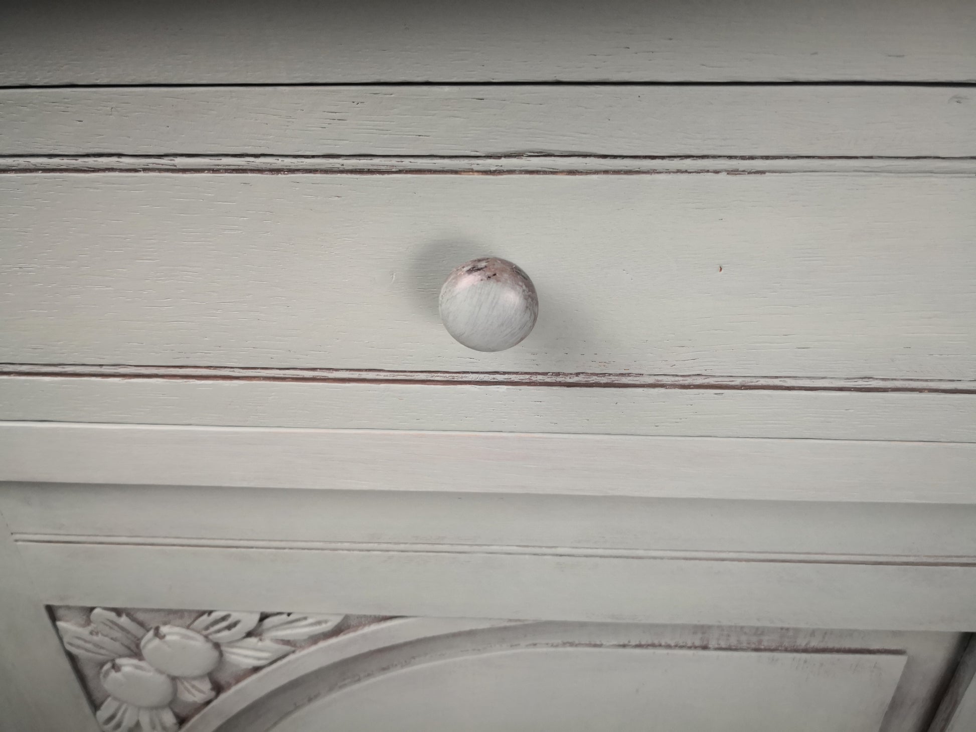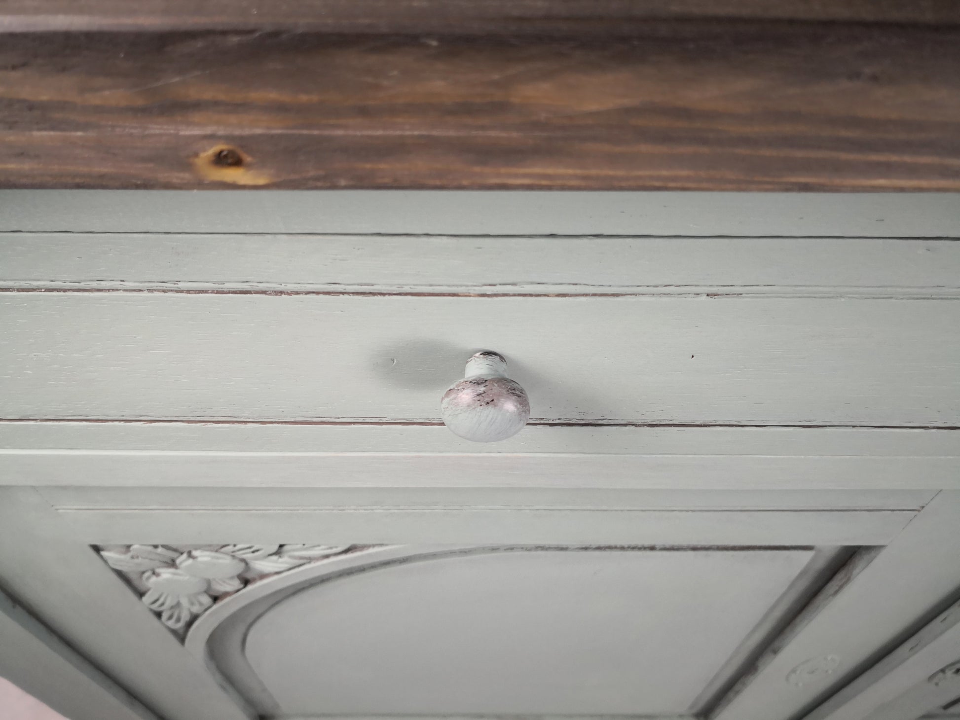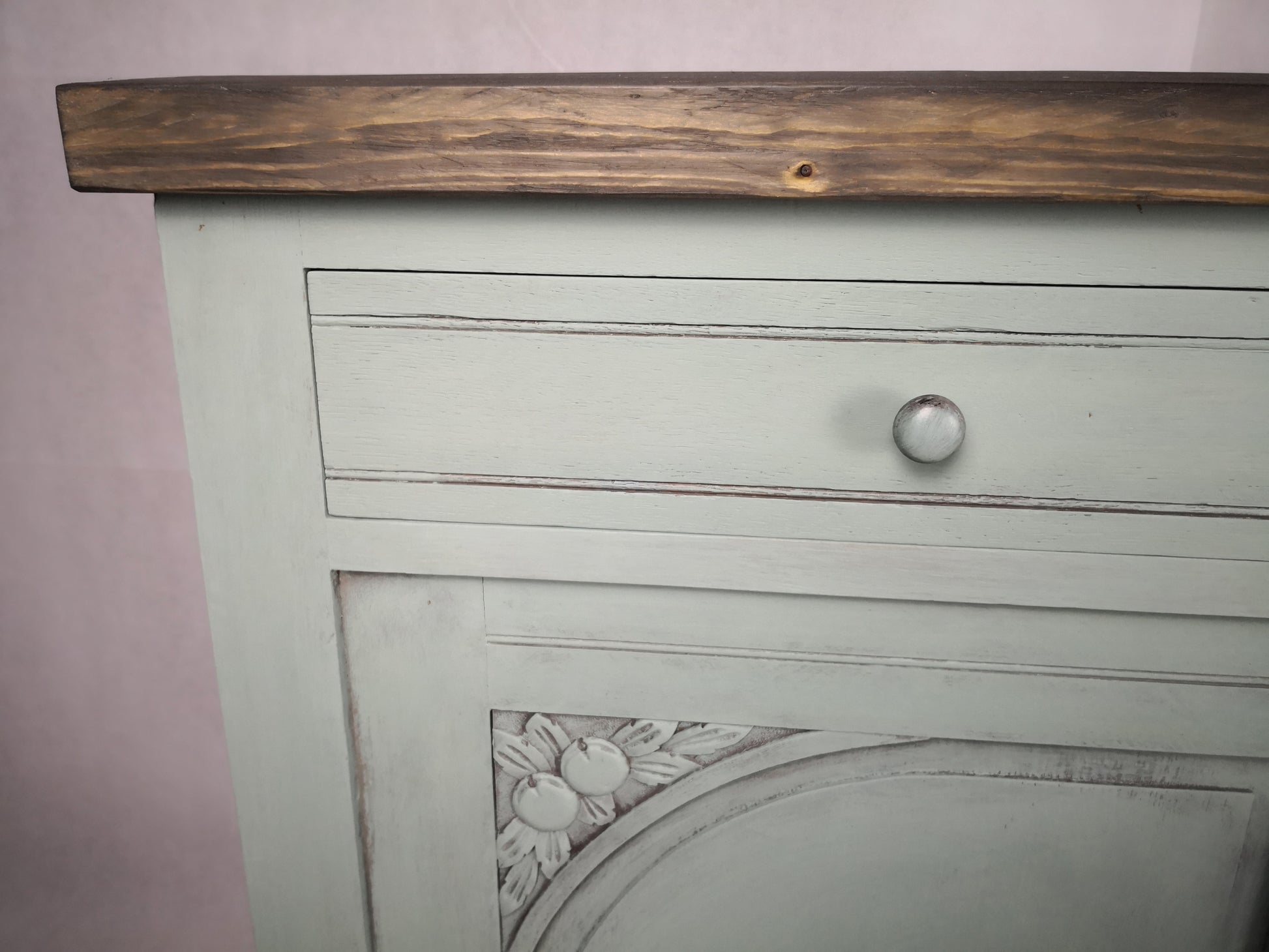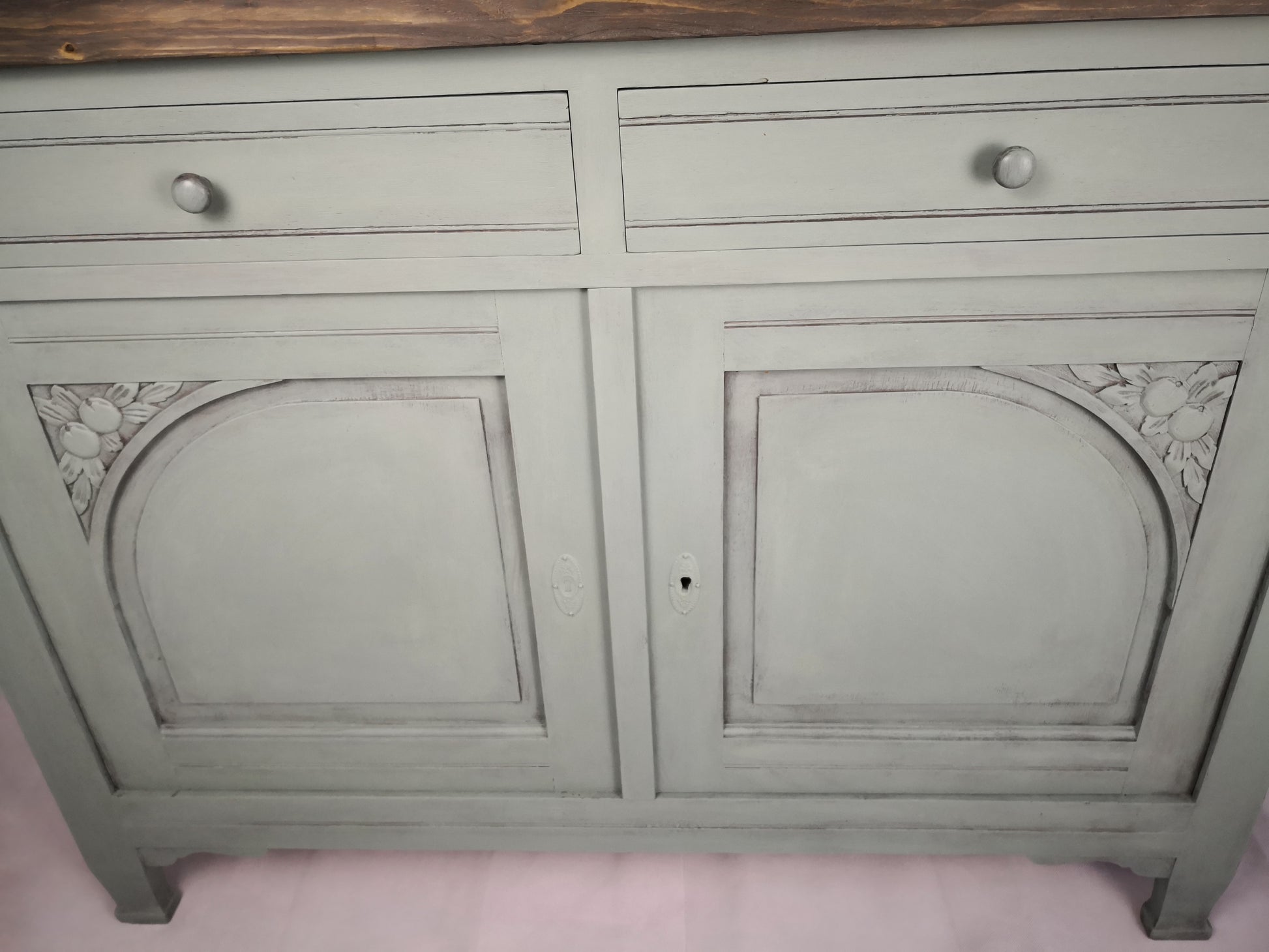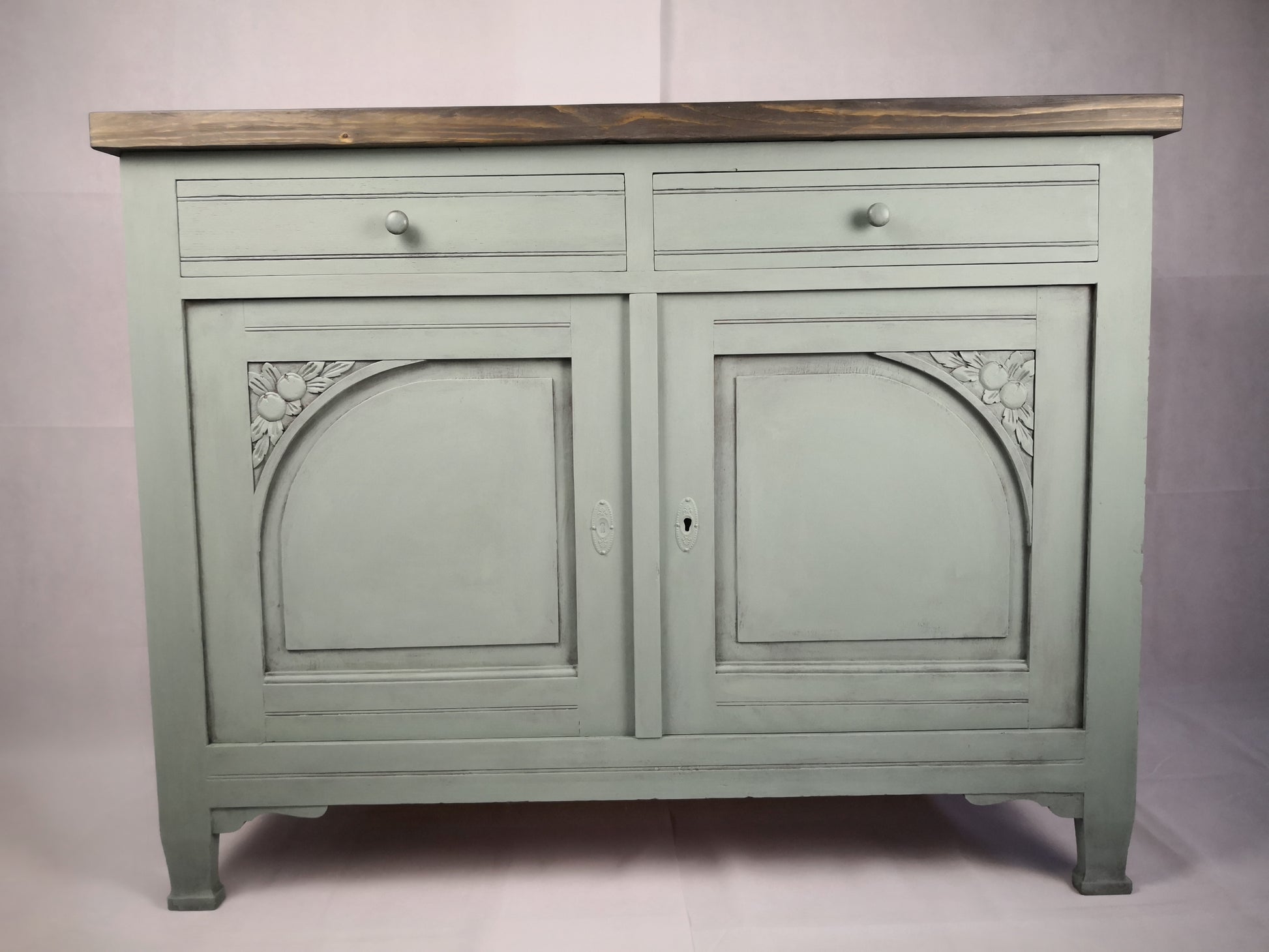 Wir haben für Euch diese große vintage Anrichte kplt. überarbeitet und mit Kreidefarbe in "seafoam green" einen neuen Look verpasst.